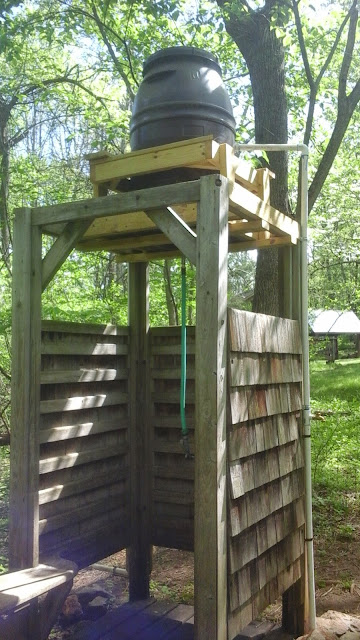 5 / 11 Into the woods by 8:15 The forest is now thick and lush with foliage, and the trail is nicely laid out. Stopped at the Jim and Dolly Denton Shelter for a break. The shelter comes equipped with an outdoor solar shower. Spotted a newt on the trail and snapped a picture.